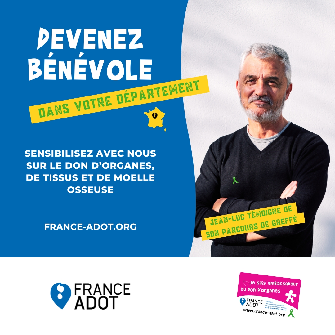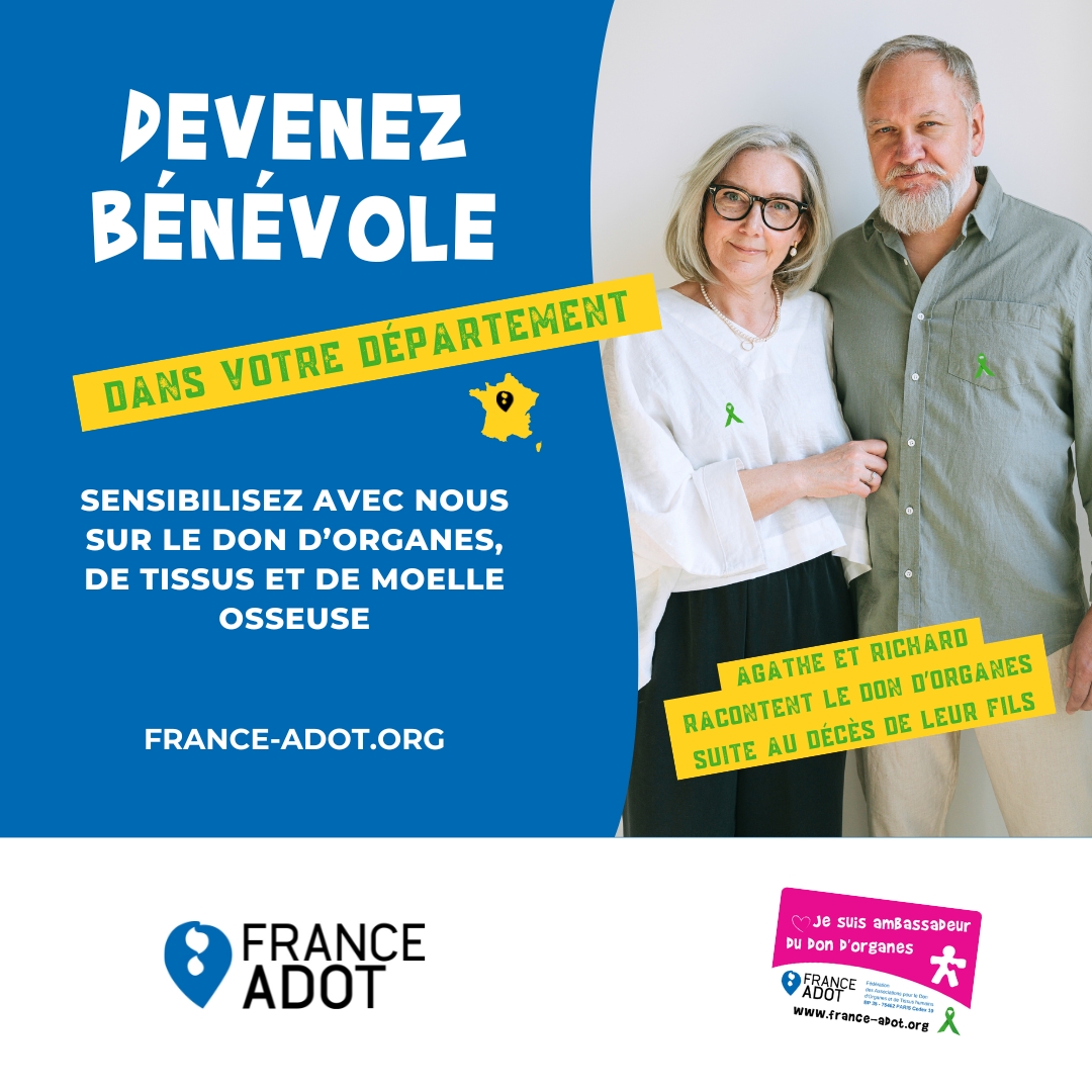 Soyez notre Ambassadeur ! Profitez de toutes les occasions pour parler du Don d’Organes et du Don de Moelle Osseuse. Et pour ceux qui n’ont pas leur carte d’Ambassadeur du don d’Organes, ou qui souhaitent se porter volontaires au Don de Moelle Osseuse, renvoyez-les vers www.france-adot.org : ils pourront télécharger leur carte ou demander à la recevoir par la poste, et s’inscrire en ligne pour devenir donneur de moelle osseuse.